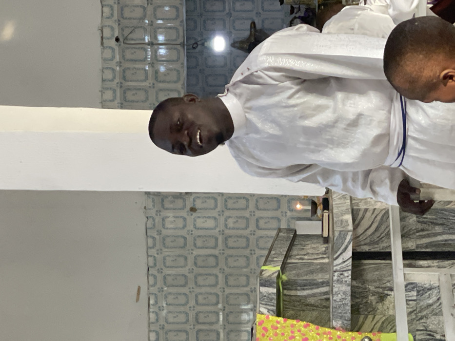 A man in a white, textured garment with a blue sash smiles. Part of a child's head is visible to the right. The background includes a wall with pale blue, patterned tiles and a white support beam. A small flame flickers on a shelf behind the man. Marble-like tiles and a yellow and pink cloth complete the scene.