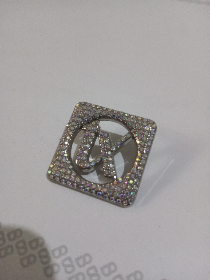 The image displays a metallic decorative object, approximately square in shape with rounded corners, resting on a flat, light gray or white surface. The object features a central circular cutout. Both the square frame and the stylized letters "M" and "K" (appearing as a common brand logo) within the circle are uniformly encrusted with numerous small, multi-faceted, clear stones exhibiting an iridescent or aurora borealis effect, reflecting various colors. The underlying metal appears to be silver-toned. The surface beneath the object shows a faint, repeating pattern of dark gray alphanumeric symbols, specifically 'B' followed by a symbol resembling 'S' or an infinity sign, visible primarily in the lower-left quadrant of the frame. A soft shadow is cast from the object towards the lower-right, suggesting a light source from the upper-left. No individuals are present, and no actions or interactions are depicted. The scene is located in Ciherang, Indonesia.