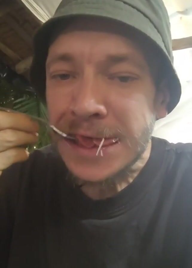 A close-up shot shows a man with a light beard, wearing a dark t-shirt with "GUNS N' ROSES" printed on it and a green bucket hat. He is eating something with a fork, and some white strands are visible around his mouth. The background includes glimpses of greenery and a white canopy or tent-like structure.