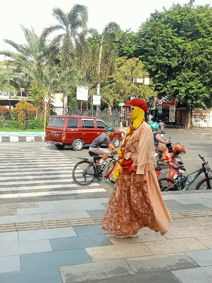 - "A woman wearing a red hat and yellow hijab, with an orange dress and crossbody bag, walks on a gray tile sidewalk towards a crosswalk" by FM-5geVz2, licensed under CC BY 4.0