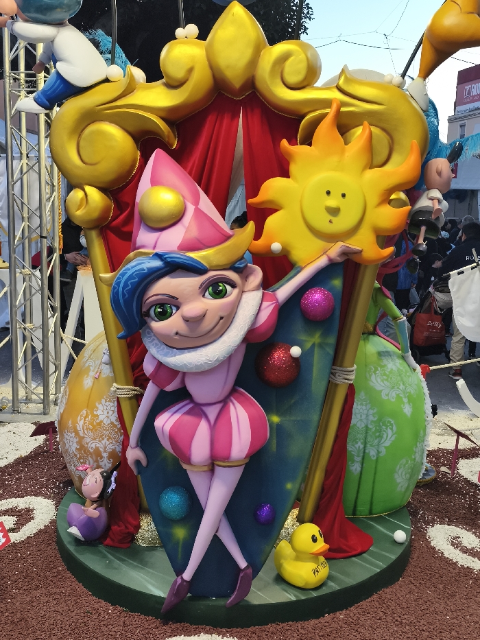 A large, colorful Falla monument is centrally depicted outdoors in Mislata, Spain