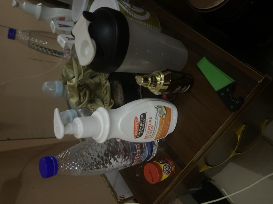 The image displays a cluttered wooden surface, likely a bedside table or dresser, in a dimly lit indoor setting in Elelenwo, Nigeria. **Objects on the surface, from left to right:** * A small, red, circular tin labeled "ROBB EXTRA MENTHOL" is positioned in the foreground. * Behind it stands a tall, clear plastic water bottle with a blue screw cap and a textured diamond pattern, displaying a partial "Sien" label. * A white pump bottle of "Palmer's Cocoa Butter Formula RETEXTURE RENEW Exfoliating Body Lotion" is centrally located. * To its right, a dark brown bottle with a gold-colored pump dispenser is present. * Further right, a clear plastic shaker bottle with a black screw-on lid and a white flip-top spout stands upright. * A white container with green and white markings is partially visible behind the shaker bottle. * In the lower right corner, a bright green-bladed utility tool with a black handle lies flat on the surface. **Background elements:** * A crumpled piece of olive-green fabric is situated behind the central items. * Several other bottles are visible in the background, including a smaller clear bottle with a light blue cap, and another clear bottle with a blue cap. * Small white rectangular boxes are discernible in the distance. * The background consists of a plain, light tan or beige wall. * A curved, gold-colored metal handle, possibly belonging to a drawer, is visible on the front edge of the wooden surface on the lower left.