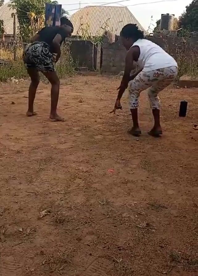 Two slender women are dancing in an unpaved dirt yard. One woman wears a black tank top and patterned shorts. The other is in a white tank top and patterned three-quarter length pants. They are barefoot or wearing sandals. A black cylinder, possibly a portable speaker, sits on the ground nearby. Behind them is a mix of low buildings and sparse vegetation.