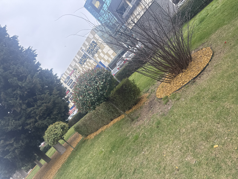 The image depicts a landscaped outdoor area in front of the Galleria Burgas shopping mall, located in Burgas, Bulgaria. The perspective is tilted, showing a grassy lawn in the foreground and midground, with areas of both green and dry, sparse grass. In the immediate right foreground, a large, bare deciduous shrub with numerous thin, dark branches is present, encircled by a distinct ring of yellow wood chips. To its left, a series of cultivated plants are arranged: a rectangularly trimmed dark green hedge segment, followed by a spherical shrub displaying a mix of green and reddish foliage, another trimmed hedge segment, and then a small tree with a rounded green canopy. Yellow wood chips also surround the bases of these plants. Further to the left and rear, a substantial, dense evergreen tree with dark foliage stands, its base also mulched with yellow wood chips. In the background, the multi-story facade of the Galleria Burgas shopping mall is prominent, featuring a distinctive checkered pattern of light-colored panels. Visible retail signage includes "GALLERIA BURGAS," "ZARA," "CCC," and "OYSHO." To the right of the main mall structure, a modern building with a blue-tinted glass facade is partially visible, displaying white text that includes "EBPOGAB." Several vehicles are partially discernible in a parking area or access road situated between the landscaped zone and the commercial buildings. The sky is uniformly overcast and grey. No human figures are present in the scene.
