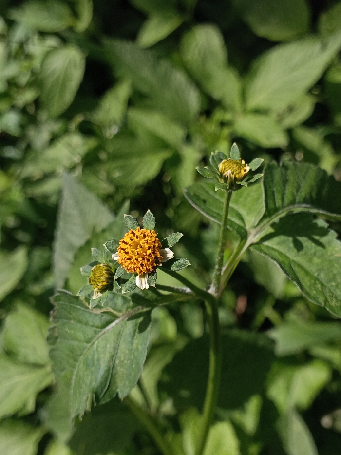 Three daisy-like flowers amidst green foliage. One blossom is fully open, showcasing a spherical cluster of vibrant orange disc florets surrounded by small white ray florets. The other two are still budding, their petals tightly closed. The leaves are a deep, veined green with serrated edges, adding depth and texture to the image. Natural light illuminates the scene, highlighting the colors and details of the flora.