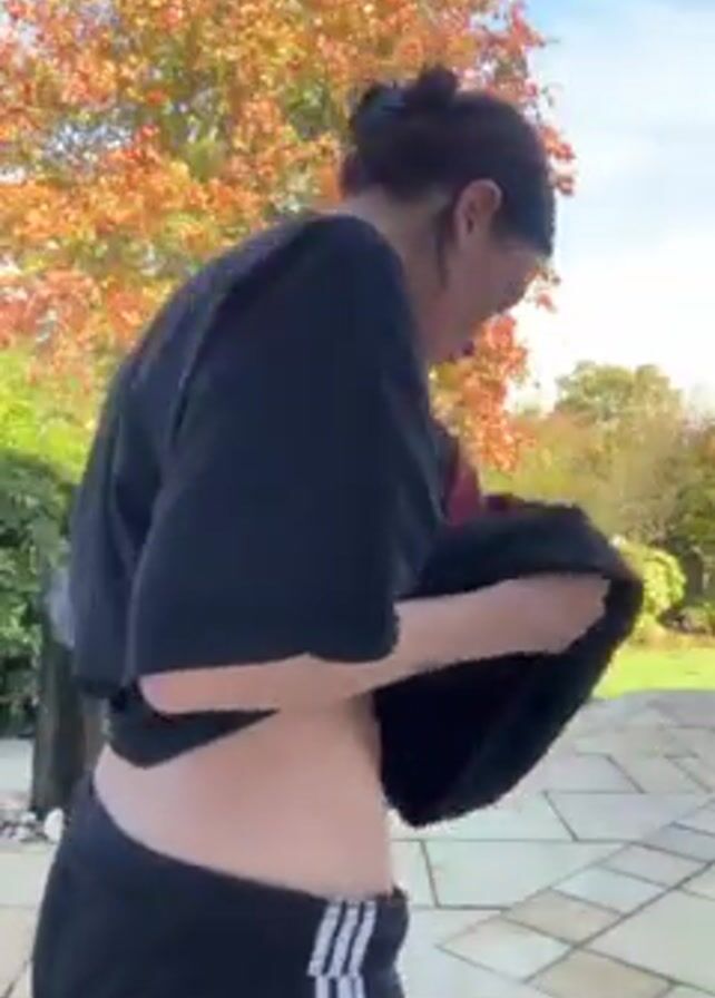 A person with dark hair tied back stands on a stone-paved patio, wearing a black T-shirt with a large red graphic, and black Adidas track pants. The person is facing away from the camera, then turns to face the camera, lifting and adjusting the T-shirt to expose the midriff. The background includes a large tree with orange leaves, a stone sculpture, a lawn, and other trees. A small, dark-colored dog walks into the scene briefly.