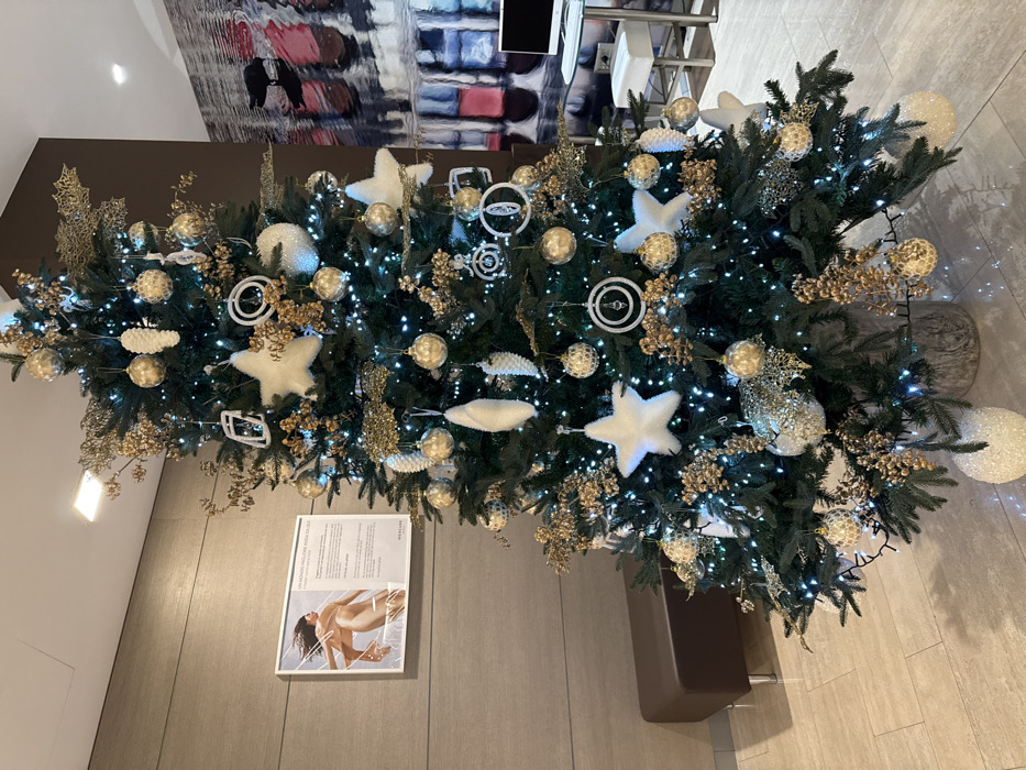 An overhead view shows a decorated Christmas tree, adorned with white stars, ornaments, and lights, standing indoors. A brochure hangs on the wall next to the tree. A brown chair is next to the tree. A painting of a group of people adorns the top wall. The scene appears to be in a public space with neutral-toned walls and floors.