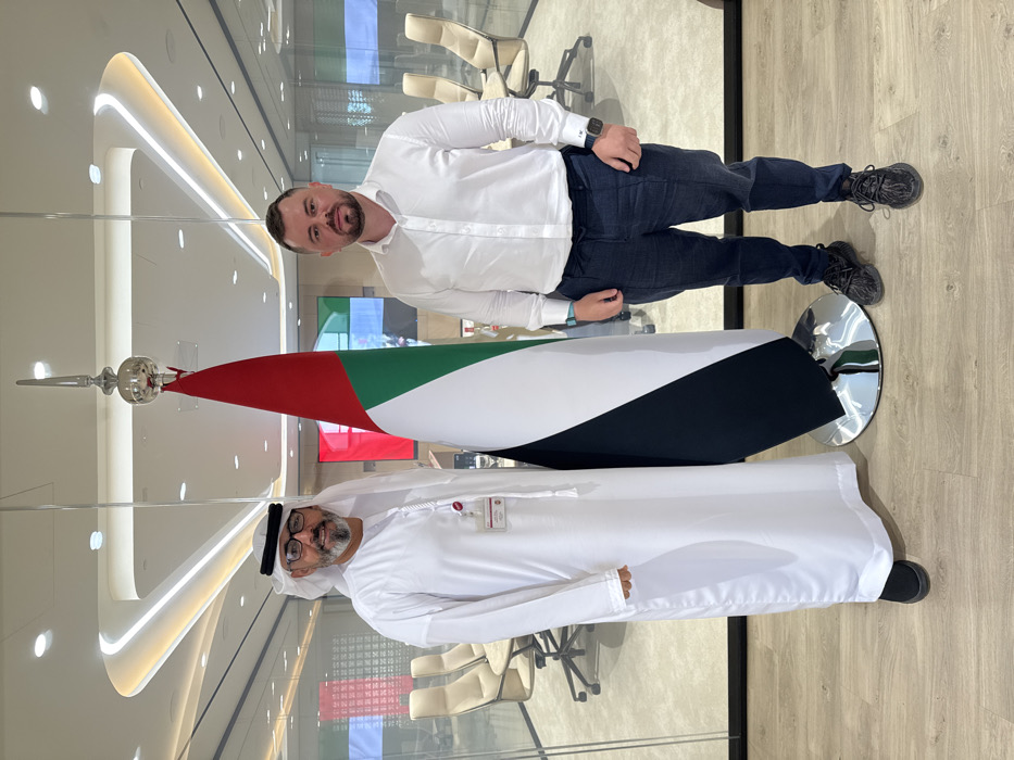 Two men pose indoors with a United Arab Emirates flag. One man wears a white shirt and dark pants, while the other wears traditional Emirati attire. Both are smiling. The setting is modern, featuring light wood floors, glass partitions, and office chairs in the background. The flag is prominently displayed. The image is bright and well-lit.