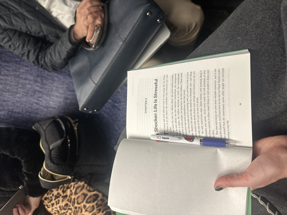 book open to Chapter 3 titled "Shocker: Life Is Stressful." It discusses how daily stressors like notifications, slow internet, plan changes, meetings, inconsiderate people, and long lines can be overwhelming. The text emphasizes that stressing about others' behavior diminishes one's power and potential. It suggests using the "Let Them Theory" to protect oneself from unnecessary stress caused by others to conserve time and energy. A pen with "Miffy" on it lies across the pages. The page number is 55.