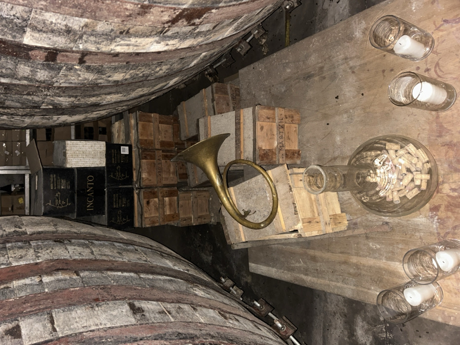 The image displays an interior scene, likely a cellar or storage area, in Unknown, Unknown. Two large, weathered wooden barrels, secured with metal bands and bolts, flank the central view. Between and behind these barrels, stacks of wooden crates and cardboard boxes are visible. Cardboard boxes bear labels such as "INCANTO" and "NENO VALLEY," while some wooden crates feature Cyrillic lettering, including "МАРТИН" and "ИВЕЛ." In the foreground, a rough wooden plank or platform extends horizontally. A brass French horn or bugle-like instrument rests on its side, partially on the wooden plank and a wooden crate. Next to the instrument, a clear glass decanter or vase, filled with numerous wine corks, is positioned. Four clear glass votive candle holders, each containing an unlit white pillar candle, are arranged around the decanter. No individuals are present.
