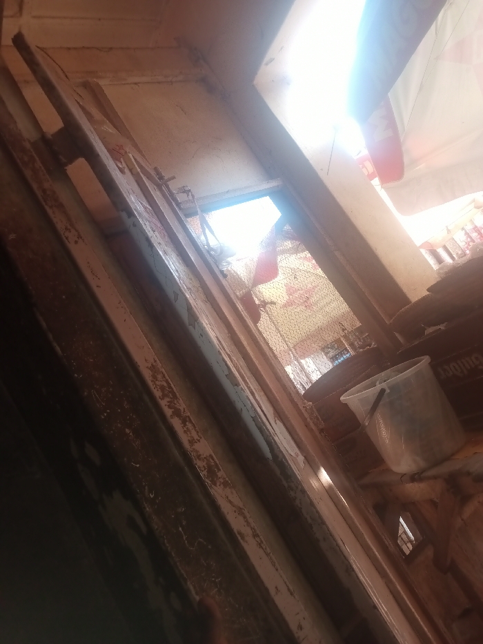 This image presents a forensically observed scene from a tilted perspective, originating from a somewhat dim interior space looking outwards into a brightly illuminated exterior, likely in the vicinity of Muhammadu Dikko Stadium in Katsina, Nigeria. The foreground on the left is dominated by multiple vertical planks or beams, dark brown and light brown, exhibiting significant wear, peeling paint, and possibly rust or grime. These elements suggest a rustic wooden or metal barrier, such as a shutter or part of a building's facade. An irregular rectangular opening serves as a portal to the exterior, through which intense bright light, likely daylight, streams in. This opening is partially obscured by a fine-mesh, light-colored netting, indicating a screen for insects or debris. Beyond the netting, the outdoor environment is indistinct but appears to be a bustling area, possibly a market or street. Visible details include a large red fabric banner or awning and a white canopy with red markings, consistent with outdoor stalls or vendor setups. To the immediate right within the interior, a clear plastic bucket with a black wire handle is positioned on a simple wooden stool or crate. The bucket contains unidentified items. Behind it, a dark container or box is partially visible, bearing the word "Gulder," a known Nigerian brand. The interior ceiling or upper wall sections are a light beige or off-white, also showing signs of age and wear. No specific individuals are clearly identifiable within the frame, but the outdoor setting and visible commercial elements suggest human activity beyond the immediate vantage point. The scene depicts a static, matter-of-fact snapshot of a functional, weathered commercial or residential interface with an urban exterior.