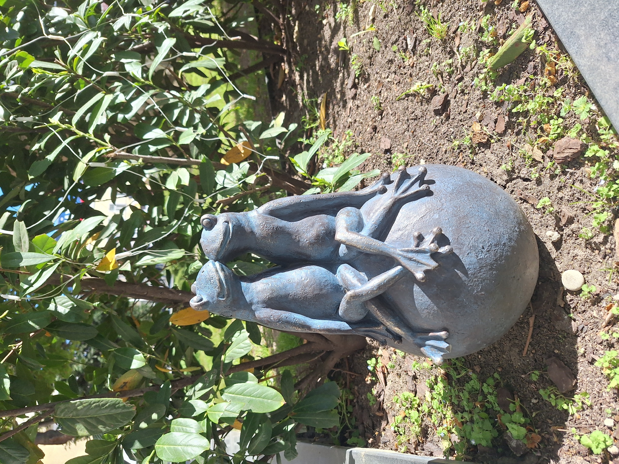bronze sculpture of two frogs intertwined on top of a sphere