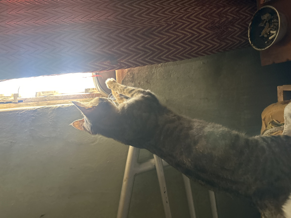 - "A domestic tabby cat, displaying a gray and brown striped coat, is captured standing upright on its hind legs, with its front paws resting on a dilapidated window sill" by FM-dusYs1, licensed under CC BY 4.0