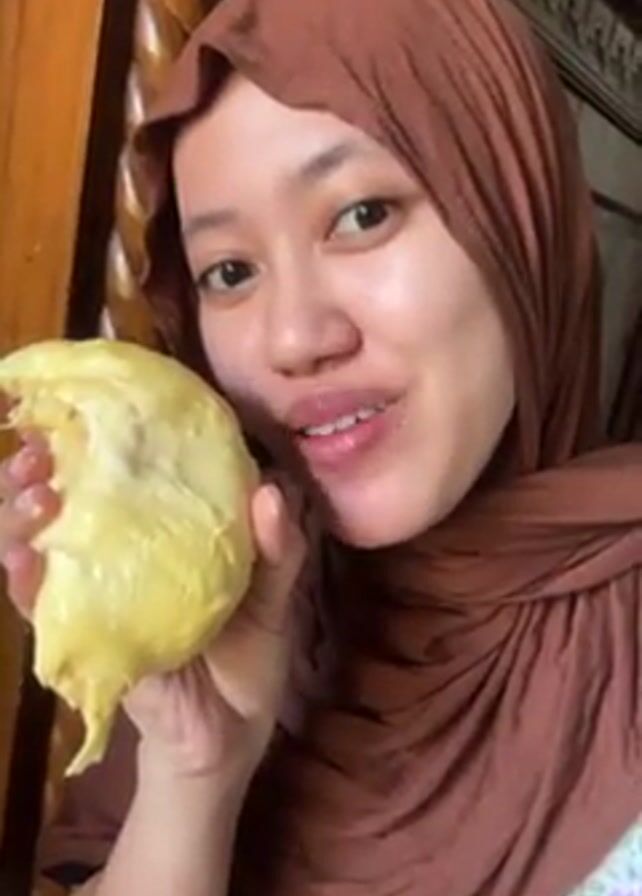 A woman wearing a brown hijab and braces is seen up close, holding a piece of durian in her hand