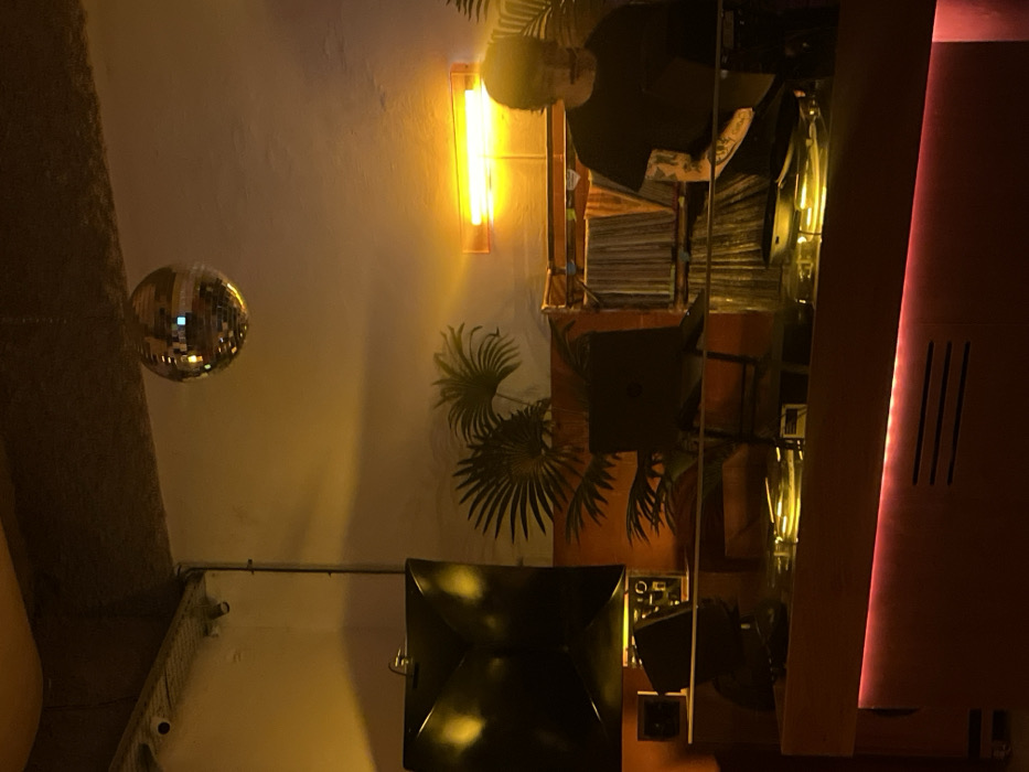 A dimly lit interior features a disco ball hanging near a textured wall. Palm tree artwork is visible behind a DJ booth, where a person stands amongst stacked records. A vertical light fixture casts a warm glow on the scene. Speakers are situated in the foreground. The image is shot at an angle, creating a distorted perspective.