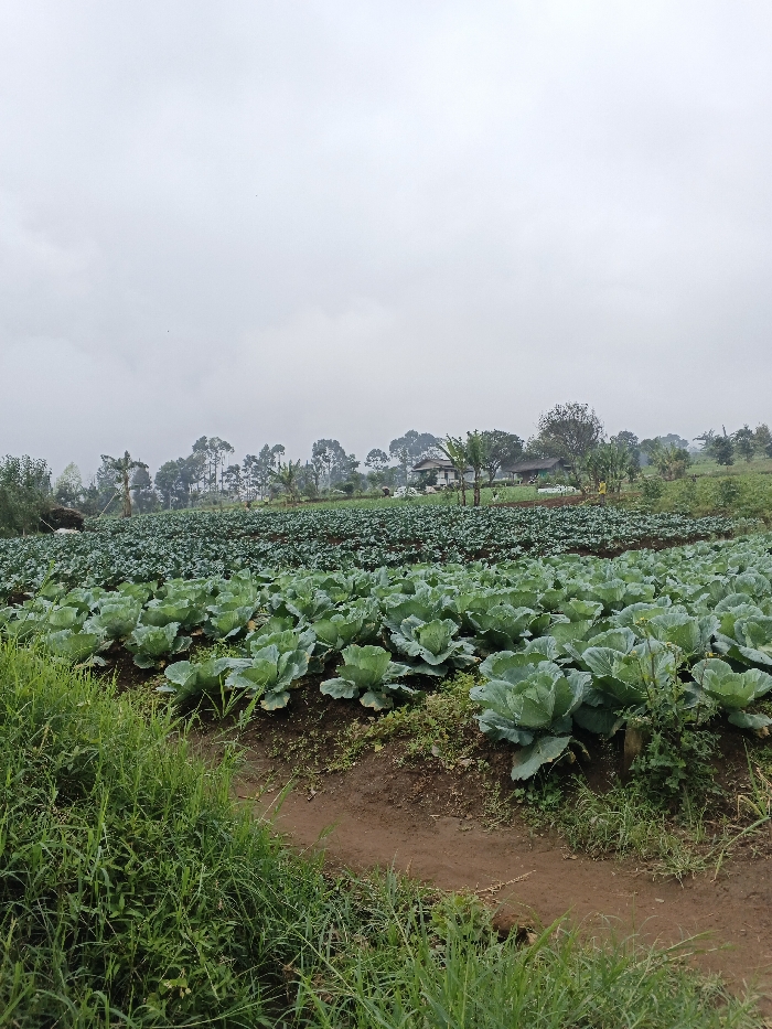 The image displays an expansive agricultural field under a uniformly overcast, light grey sky in Unknown, Vietnam. In the immediate foreground, a narrow dirt path or trench separates a strip of green grass and weeds on the left from cultivated land. The midground is largely occupied by rows of mature, light green cabbage plants arranged on dark brown soil, extending into the distance where smaller, darker green leafy crops are also visible. The background features a distinct treeline composed of various species, including tall conifers and broader-leafed trees. A light-colored house with a dark roof is situated on a gentle slope amidst the trees towards the right of the frame, with other indistinct structures partially obscured by foliage. No individuals, animals, or specific actions are depicted within the scene.