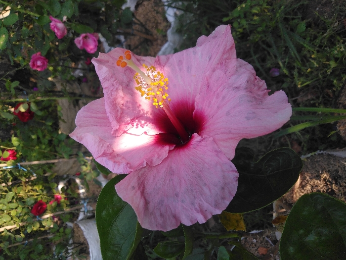A close-up photograph taken in a garden in El Nayar, Mexico, depicts a light pink hibiscus flower prominently in the foreground. The flower features broadly spread pink petals, a deep red throat, and a central white stamen adorned with numerous yellow pollen-bearing anthers and five distinct orange-tipped stigmas. Direct sunlight illuminates a section of the upper petals and the stamen, casting bright highlights. Dark green leaves of the hibiscus plant are visible beneath and to the left of the bloom. The background is blurred, showcasing additional green foliage, several rose bushes with red and pink blossoms contained in white fabric pots, and a sparse ground cover of soil and grass. No human subjects or discernible actions are present. The environment is an outdoor horticultural setting under natural daylight.