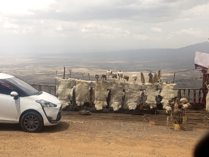 A white car is parked next to a display of sheepskin rugs and other handicrafts on a wooden platform. The platform overlooks a vast, dusty plain with mountains visible in the distance under a cloudy sky. The merchandise is arranged on a railing, featuring hats, skins, and decorative objects. The scene has a touristy feel with a viewpoint to take in the expansive landscape.