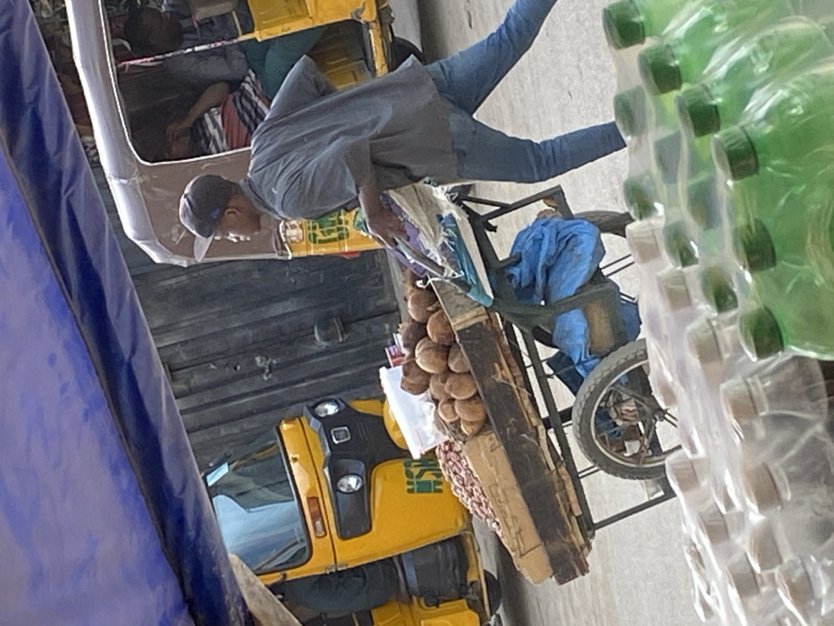 A man in a gray shirt and jeans stands near a yellow three-wheeled vehicle with a person inside. He is next to a bicycle cart loaded with coconuts. To the right, there is a stack of plastic bottles wrapped in plastic. The scene suggests a roadside market or commercial activity.