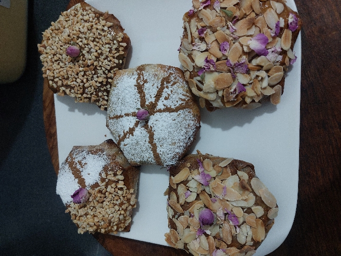 - "Five Moroccan pastries are arranged on a white plate, set on a wooden surface" by FM-gCkm43, licensed under CC BY 4.0