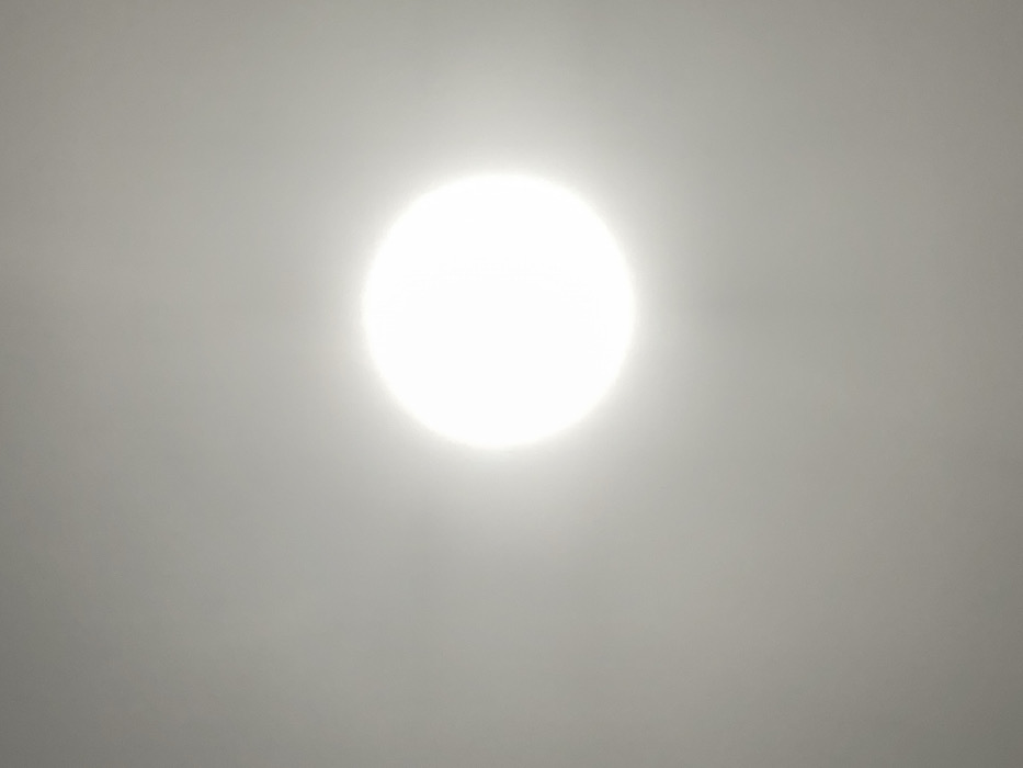 The image displays a single, intense white circular light source, centrally positioned against a uniform light grey background. This scene is located in Okura, Nigeria. The light source emits a strong, diffused glow, radiating outward into the surrounding greyness. No other discernible objects, individuals, or environmental features are present within the frame. The overall appearance suggests an obscured sky condition, possibly involving haze, fog, or dense cloud cover, where the sun is the dominant, almost featureless, bright object.