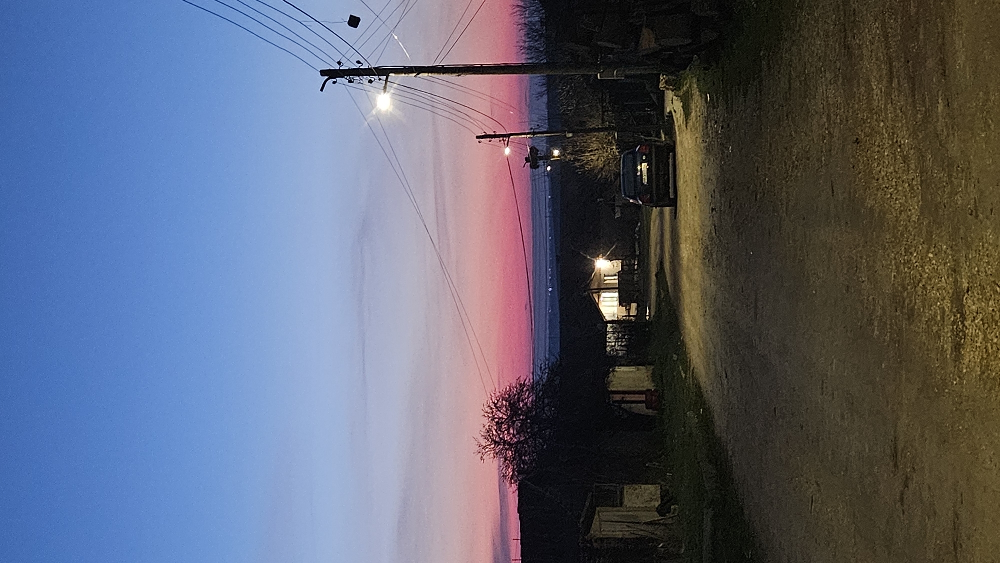 A nighttime scene in what appears to be the city of Vazovo, Bulgaria, features a blue and pink sunset sky. An asphalt road is seen on the right side of the image, lit by overhead street lights. Electrical poles and lines are seen against the sky. A dark-colored car is parked on the road, near a lit building. Vegetation is visible along the side of the road. A small structure is seen near a tree.