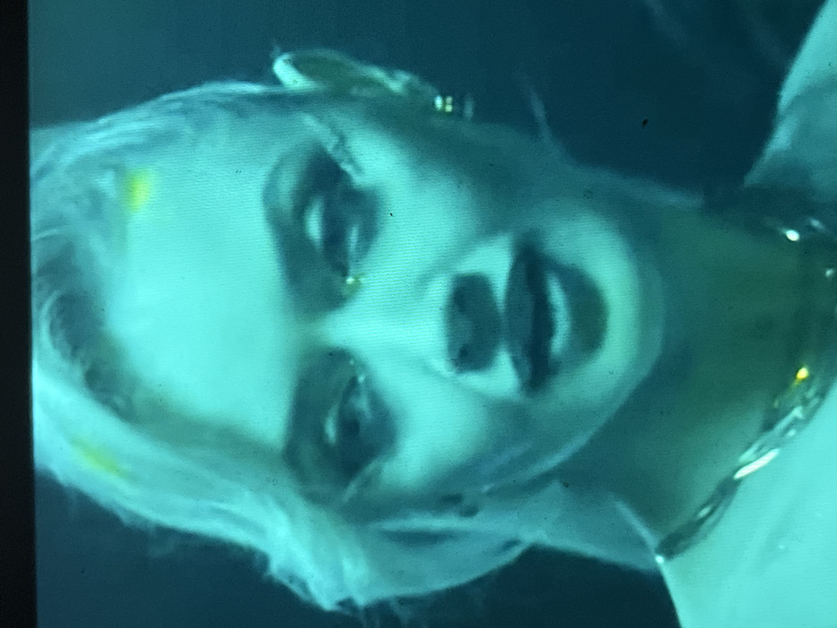 A close-up shot of a person's face, tilted diagonally. The individual has fair skin and platinum blonde hair. Their eyes are dark, and they appear to have a nose ring. They are wearing a thick, golden chain or collar. The overall color scheme is a cool cyan or bluish-green tone, with slight yellow tints in the hair. There are minor imperfections on the skin and hair visible in the image.