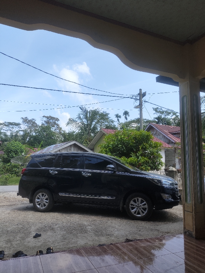 The image displays an outdoor residential environment in Serbajamanbaroh, Indonesia, viewed from a covered porch area. In the foreground, the lower portion of a tiled floor, dark brown with lighter reflections, is visible. Several pairs of dark-colored sandals and slippers are scattered on the ground adjacent to the tiles. Above, a beige, curved architectural element extends across the top of the frame, indicating a roof overhang or beam. In the midground, a black Toyota Kijang Innova multi-purpose vehicle (MPV) is parked on a light brown dirt or gravel surface. The vehicle is oriented facing right, showcasing its left side with tinted windows and chrome accents on the door handles and lower body trim. The background features dense green foliage and numerous trees, including several palm trees, indicating a lush, possibly tropical, setting. Two residential structures are partially visible: one on the left with a corrugated metal roof and another further back to the right with a red-tiled roof. Overhead utility lines crisscross the bright blue sky, which contains scattered white cumulus clouds. A utility pole with crossarms and wires is also visible in the upper mid-right area. No individuals are present, and no actions or interactions are depicted.