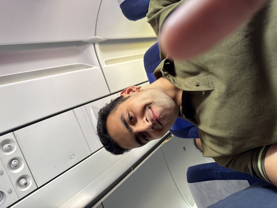 The scene depicts the interior of a commercial aircraft cabin. A young adult male, with dark hair and a light complexion, occupies the foreground, facing the camera with a smile. He wears an olive green collared polo shirt and a small gold hoop earring in his right ear. His right index finger, blurred and out of focus, extends into the lower right corner of the frame, suggesting the image is a selfie. Behind him, another individual's head is partially visible in an adjacent seat. The aircraft cabin features white overhead panels with recessed air vents and individual reading lights. The seats are upholstered in blue fabric with grey headrest covers. Visual evidence within the image does not permit confirmation of a specific geographic location within Jaipur Municipal Corporation, India.