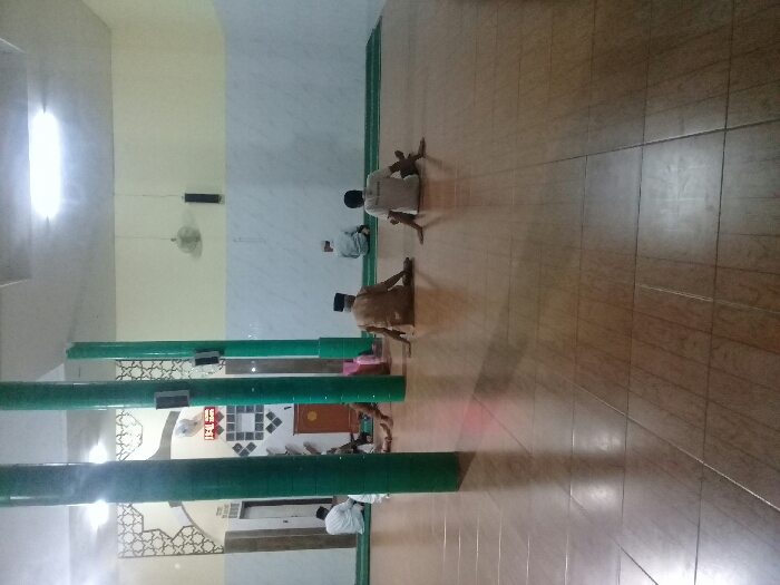 The scene is inside a building with a tiled floor. Several individuals are praying on the floor. Green pillars run along the wall of the building. The ceiling is white with a large circular light fixture. There is a window with a wooden frame and a door with a green frame. It is unclear whether this is a mosque or a home. The image is taken from a slightly elevated position, looking down. The location is Unknown, Unknown. The latitude and longitude provided are not valid geographic coordinates.