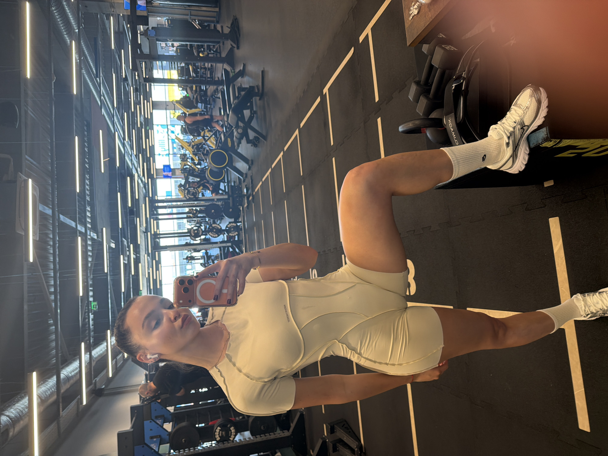 The image depicts a woman taking a selfie in a gym