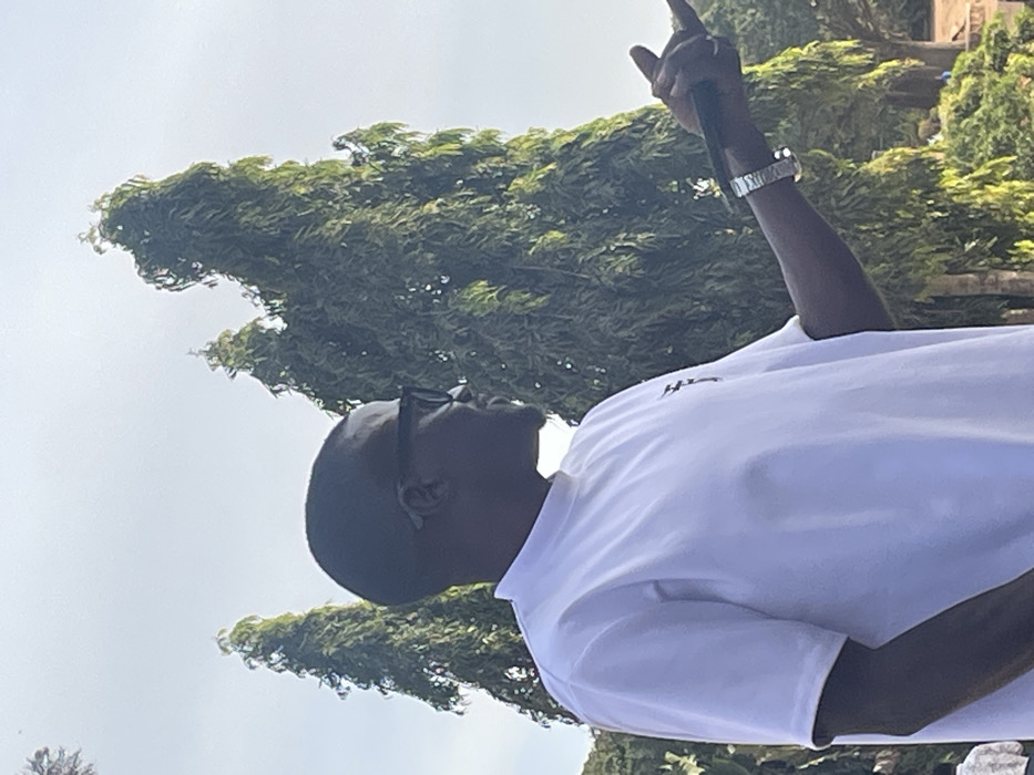 The image captures an outdoor scene in Jos, Nigeria, featuring a dark-skinned male in profile, facing right. He has short dark hair and a neatly trimmed beard, and is wearing black sunglasses. His attire consists of a loose-fitting white short-sleeved t-shirt with a small dark emblem on the left chest. A silver-toned watch is present on his left wrist. His left hand is raised, holding a dark, rectangular object, possibly a smartphone or microphone, with his index finger slightly extended as if gesturing. The background is dominated by several tall, slender trees with dense green foliage, set against a clear, light blue sky, indicating a sunny daylight environment. Faint details of an unpaved area are visible in the far background.