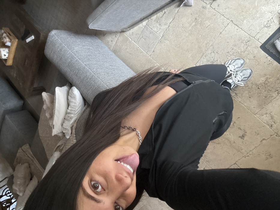 A female subject, viewed from a high-angle selfie perspective, is captured indoors from the upper chest to the knees. She has long, dark hair, dark eyes, and a fair complexion, and is looking directly at the camera with a slight smile and her tongue extended. She wears a black long-sleeved activewear top, partially unzipped to reveal a black sports bra underneath, black leggings, and grey and white athletic shoes with white laces. A silver-colored anchor-link chain necklace adorns her neck. The background shows a contemporary living space with light grey, modular fabric sofas, accented by several cream-colored throw pillows and blankets. A dark wooden coffee table in the upper right background holds a wooden tray containing decorative items and a white remote control. The flooring consists of light-toned, possibly stone or ceramic, tiles with visible grout lines. A dark mat is partially visible in the bottom right corner of the frame. The indoor residential setting provides no discernible features to identify a specific location within Antibes, France.