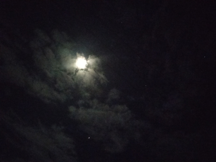 The scene depicts a night sky over Tanohmanyang, Indonesia. A bright, luminous celestial body, consistent with the moon, is prominently visible in the upper-left quadrant, partially obscured by a formation of dark, textured clouds. The moon's light radiates through and around the cloud cover, creating a diffused glow. The surrounding sky is dark black. Scattered across the darker regions of the sky are several faint, pinpoint white objects, likely stars or planets. No terrestrial features, structures, or individuals are present in the frame. The environment is entirely atmospheric, representing an outdoor nocturnal setting.