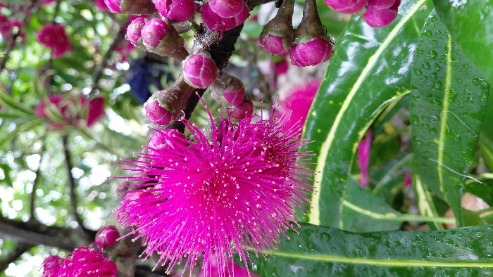 A vibrant pink Malay apple blossom takes center stage, its numerous stamens creating a fluffy, textured appearance