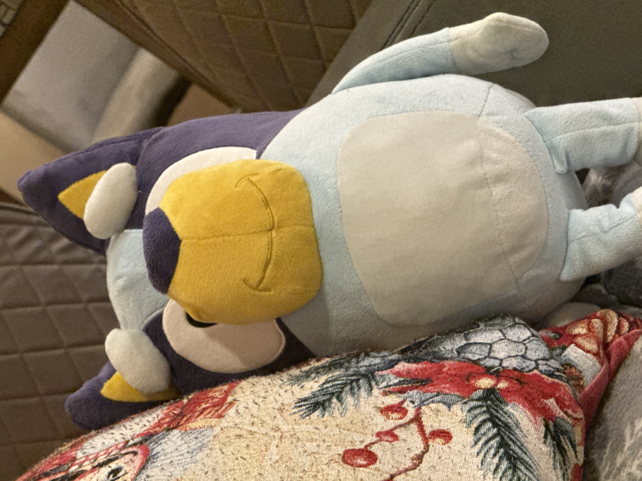 The image depicts a plush toy resembling the character "Bluey," positioned upright and leaning against a decorative cushion in what appears to be an indoor domestic setting