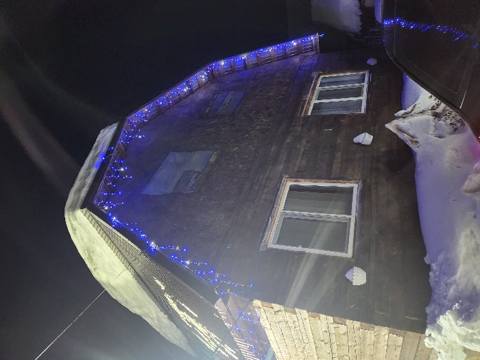 A two-story, dark wooden house, located in Chaikovsky, Russia, is depicted at night under snowy conditions. The steep, gabled roof is heavily covered in white snow, and blue LED icicle string lights illuminate the eaves on both visible sides. The exterior walls are constructed of dark horizontal wooden planks. The lower level features a large white-framed window on the left and two smaller white-framed windows grouped together on the right. The upper gable facade presents two smaller, rectangular, light blue-tinted windows. Two white, inverted cone-shaped fixtures are mounted on the lower front wall. Deep snowdrifts surround the base of the house. The rear section of a dark-colored vehicle, partially covered in snow, is visible in the bottom right foreground. The night sky above is dark, with a faint, wispy cloud formation visible in the upper right. No individuals are present in the scene.