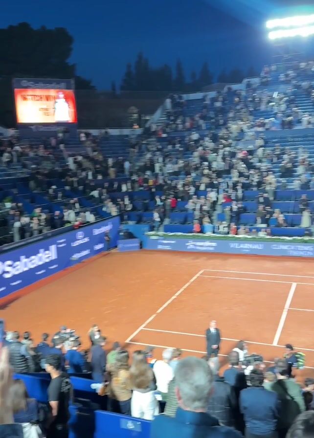 Here is a brief description of the video: The video shows a tennis match on a clay court at night, taken from an elevated spectator seat. The stadium is packed with spectators in blue seats. There are floodlights illuminating the court. The camera pans across the court and crowd, focusing on the players and officials at the net. There are advertisements visible along the sides of the court, including "Sabadell," "Lexus," and "Haier." A video screen displays an image and the words "Match Winner." Many people are holding up cell phones to record or take pictures. The sky is a deep blue, indicating it is dusk or night.