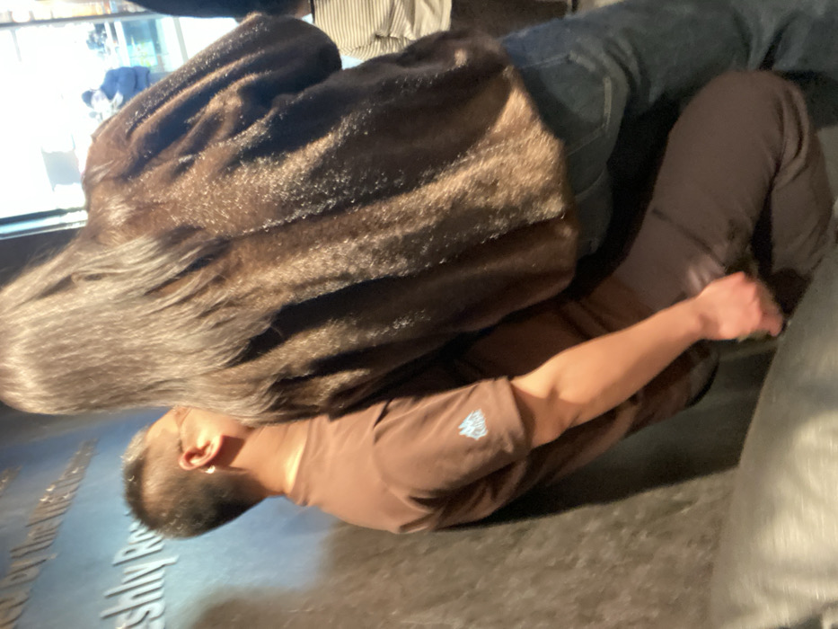The image depicts an indoor scene with two individuals in close proximity. A male subject, observed from the back and side, wears a brown short-sleeved t-shirt with a light blue Kappa logo, dark trousers, and eyeglasses, and leans against a dark, textured wall. Portions of illuminated, raised text, including "shly Ro" and "by the," are visible on this wall. A female subject stands immediately in front of the male subject, viewed from behind, wearing a dark brown fur or faux fur jacket and blue jeans. Her long, dark brown hair extends down her back. Her body is positioned directly against the male subject's back. Faint figures and reflective surfaces, possibly a glass display or window, are discernible in the distant background to the right. The exact location within Taihe District, China, cannot be determined from the provided image.