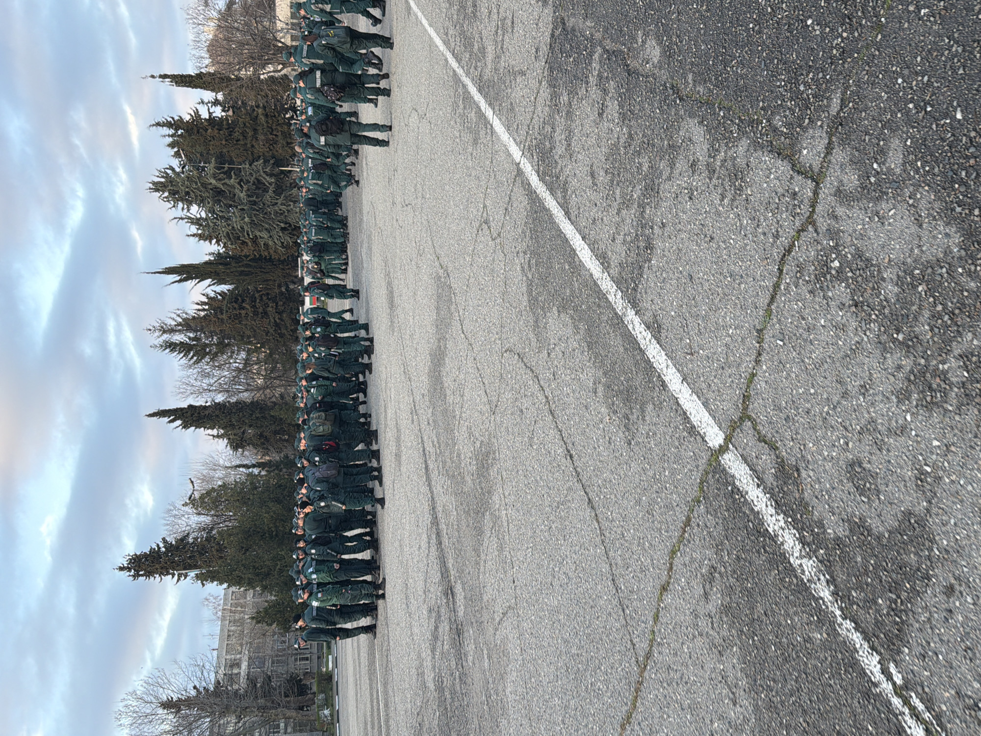 large group of people, possibly military personnel, standing in formation on an asphalt surface with a white line marking