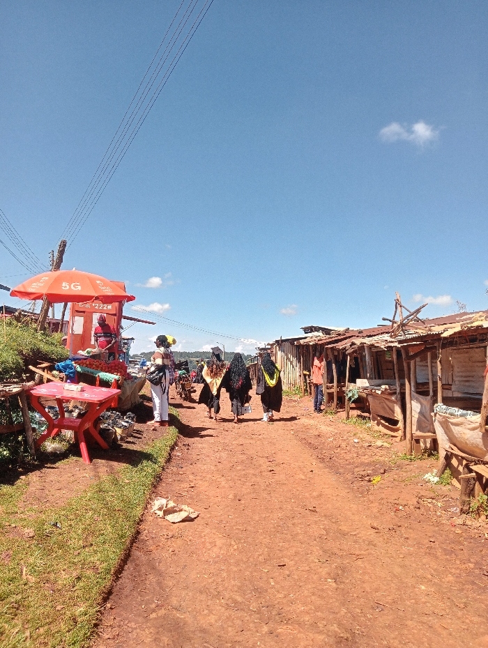 The image displays an unpaved, reddish-brown dirt road within a market area in Waseges ward, Kenya, under a clear blue sky with minimal cloud cover