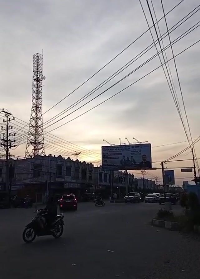 street scene at dusk. A tall communication tower is visible to the left of the frame, standing beside several two-story buildings. Overhead, a network of power lines crisscrosses the sky. In the center of the view is a four-way intersection with cars and motorcycles moving through it. A large billboard promoting a university is positioned above the intersection. The sky is filled with a mix of light gray clouds and a bright orange glow from the setting sun, which is visible on the horizon. A few individuals can be seen on motorcycles, and some pedestrians are walking along the sidewalks. The environment suggests an urban or suburban setting in the evening light.