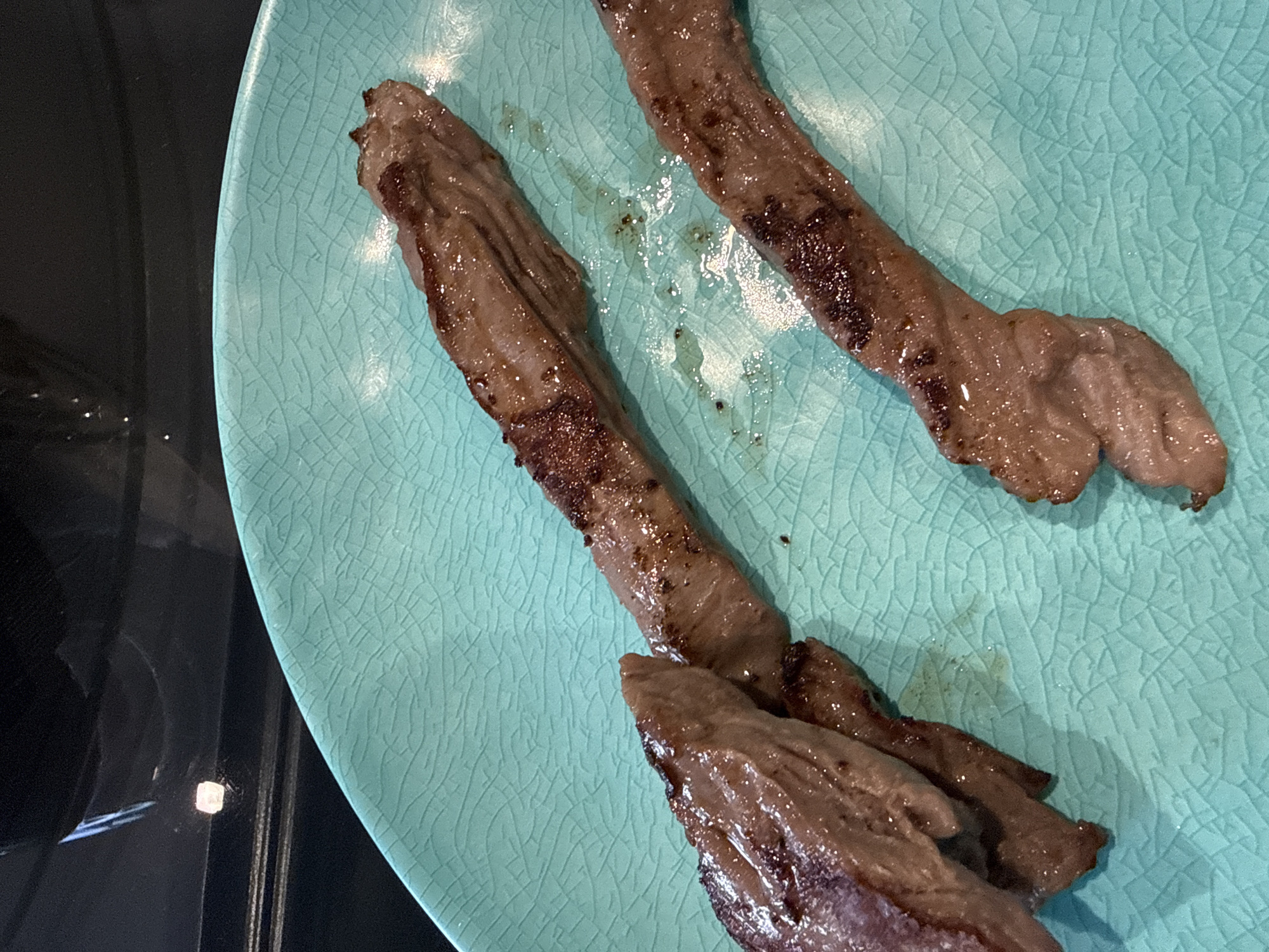 The image depicts two strips of cooked meat on a light blue, textured plate