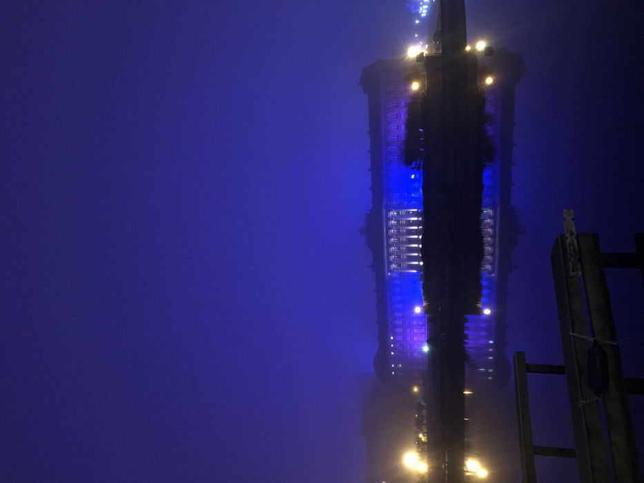 A tall building with blue and orange lights is the primary focus, reflected in a dark body of water. Fog obscures the base and top of the building, creating an eerie, ethereal atmosphere. A wooden structure sits in the right foreground, its details softened by the dark and foggy conditions. The sky above is a solid deep blue, contributing to the overall surreal and mysterious mood of the scene.