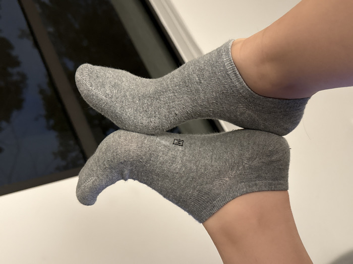 Two feet stacked one on top of the other, both wearing low-cut gray socks. The upper foot rests on the heel of the lower foot. The socks are slightly worn and textured. A window with reflected light is in the background. The legs are pale, and the background behind the feet is a light color.