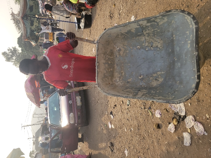 The image captures an active outdoor market scene on a dirt road in the city of Iddah, Nigeria. Centrally, a young Black male, appearing to be in his late teens or early twenties, stands holding the metal handles of an empty, well-worn grey wheelbarrow. He wears a red short-sleeved football jersey with a white collar and a "Snapdragon" logo. The ground is dry, light brown earth, strewn with white plastic bags, wrappers, and small debris. To the left of the central figure, a maroon Volkswagen Golf car is parked, facing right, with its front passenger door ajar and a person partially visible near the opening. The car displays a Nigerian license plate, partially legible as 'AYB-711-KJA'. In the midground and background, the scene is populated by numerous individuals engaged in market activities. Several market stalls are visible, characterized by colorful canopy umbrellas (one red, one green/blue striped) providing shade. People are observed standing and seated, with some next to large black buckets or containers. Further down the road, a yellow tricycle and a person on a motorcycle are visible. The background features power lines, utility poles, and distant, hazy hills under a bright sky, indicating daytime conditions.