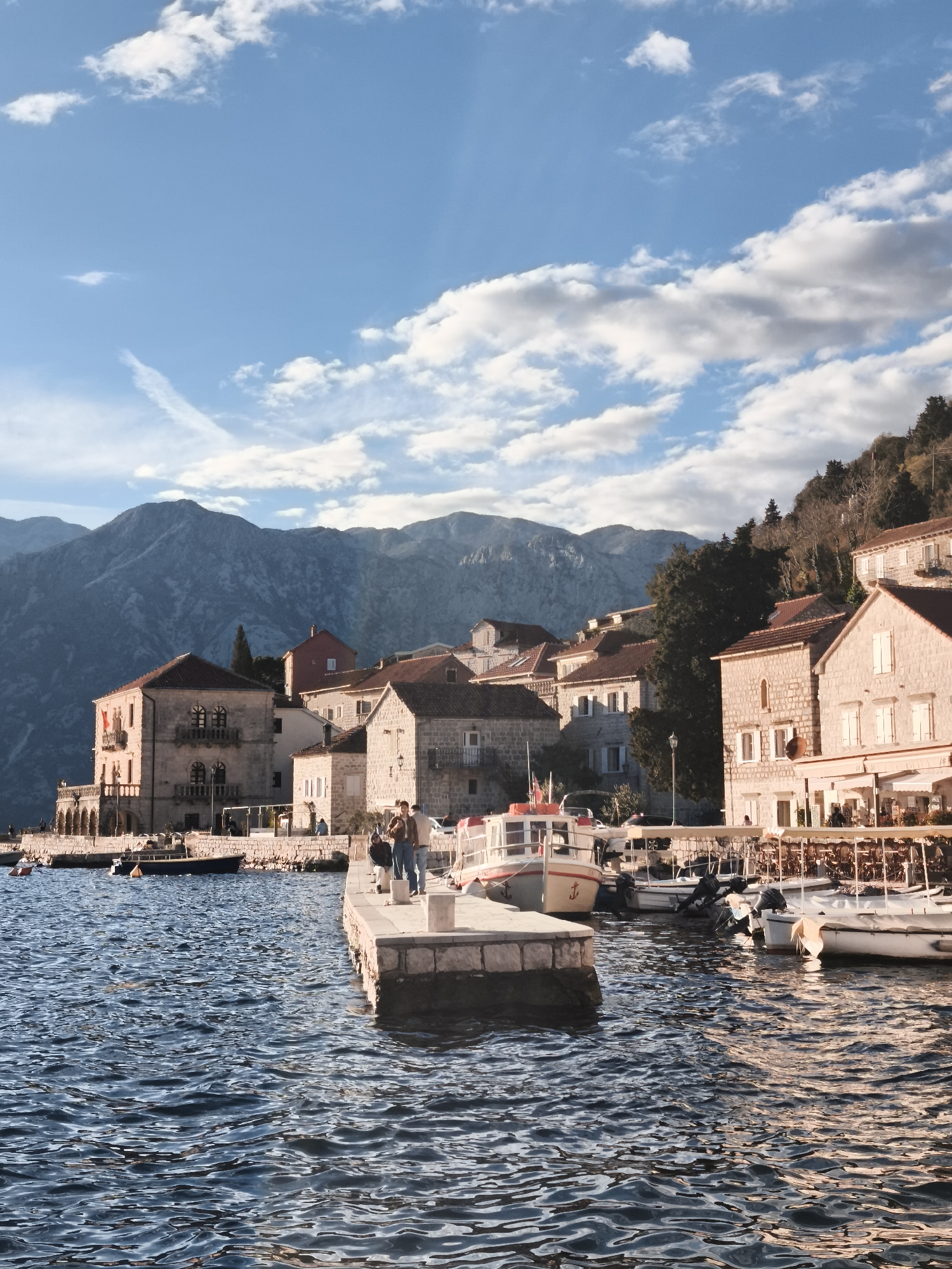 The image captures a serene scene in Perast, Montenegro. The foreground is dominated by the Adriatic Sea, its surface rippling in the sunlight. A stone pier juts out into the water, where two figures stand. Behind them, the architecture of Perast is visible, featuring closely clustered stone buildings with red-tiled roofs. These buildings are set against the backdrop of mountains. Moored boats bob gently along the quay. The sky overhead is a mix of blue and white clouds, with beams of sunlight filtering through.