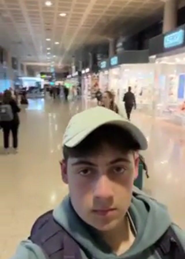 A young man is holding a camera, recording a selfie-style video in an airport