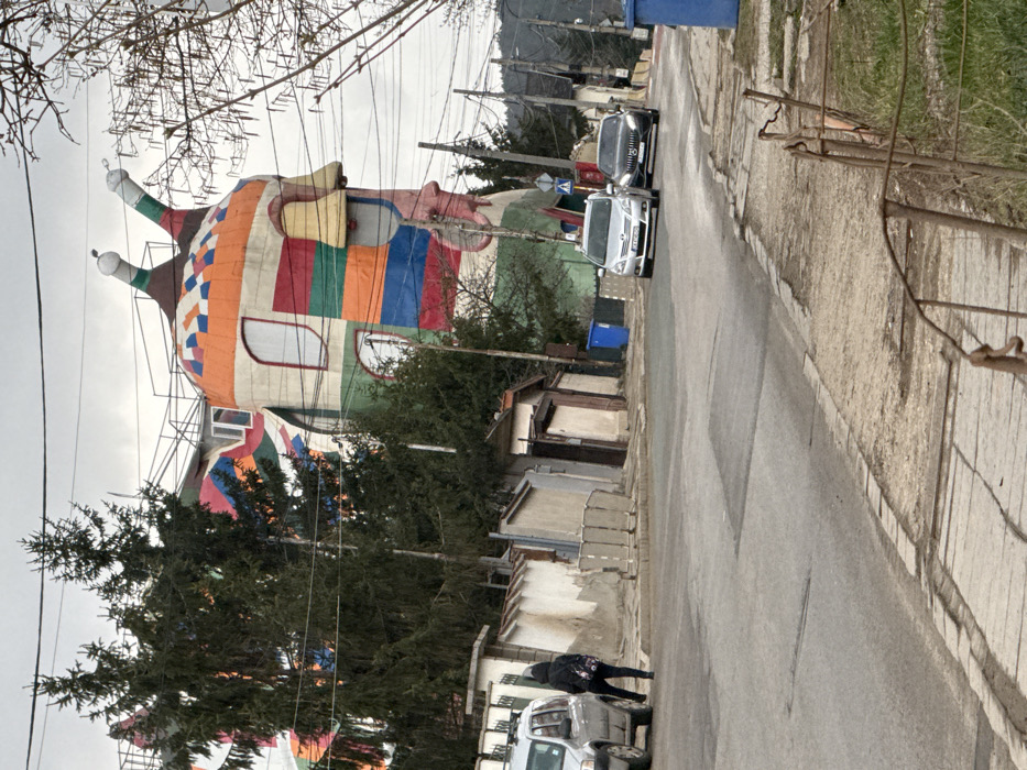 The image displays an exterior street view of the "Snail House" (Kushtata Ohlyuv), a distinct multi-story building situated in Sofia, Bulgaria. The structure is characterized by its curvilinear, snail-like form and a vibrant, multicolored facade featuring horizontal bands and checkered patterns in shades of orange, green, red, blue, yellow, white, and brown. Two white-tipped antennae-like projections extend from its roof. Scaffolding is visible on the upper left exterior of the building. The scene is a residential street under an overcast sky, with multiple overhead power lines traversing the frame. On the left side of the asphalt street, a silver SUV is parked. One individual, seen from behind, dressed in dark clothing and carrying a backpack, walks on the concrete sidewalk adjacent to the parked vehicle. Behind the person, a series of concrete walls and fences delineate properties. On the right side of the street, two vehicles are partially visible, facing the viewer: a silver compact MPV followed by a dark sedan. A blue recycling bin is positioned on the sidewalk to the left of these vehicles. Evergreen trees are interspersed throughout the scene, particularly around the Snail House and along the properties. A rusty metal fence segment occupies the lower right foreground. A pedestrian crossing sign is visible on the right side of the road.