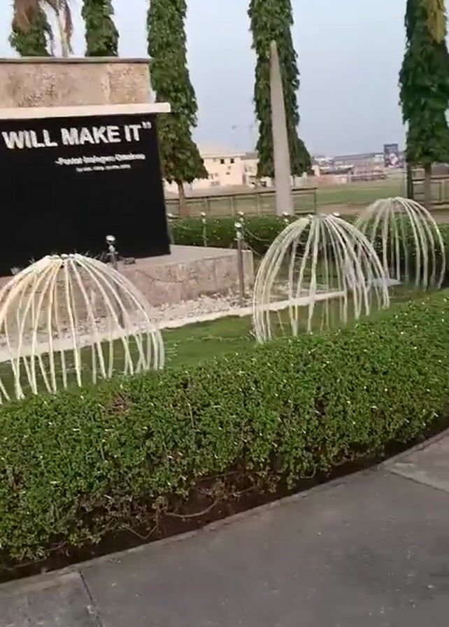 The camera pans slowly across a garden scene. In the background, a stone monument stands with text on a black placard that reads: "You Will Make It"-Pastor Iwalegwu Omakwu. Text to the left of the placard reads "Anchor FWC Men's Fellowship." There are three white, globe-shaped structures in front of the monument, surrounded by greenery. A cactus plant is featured prominently. Tall, slender trees line the back of the scene. Buildings and a sports field are visible in the distance. A paved walkway is in the foreground. The sky is slightly overcast.